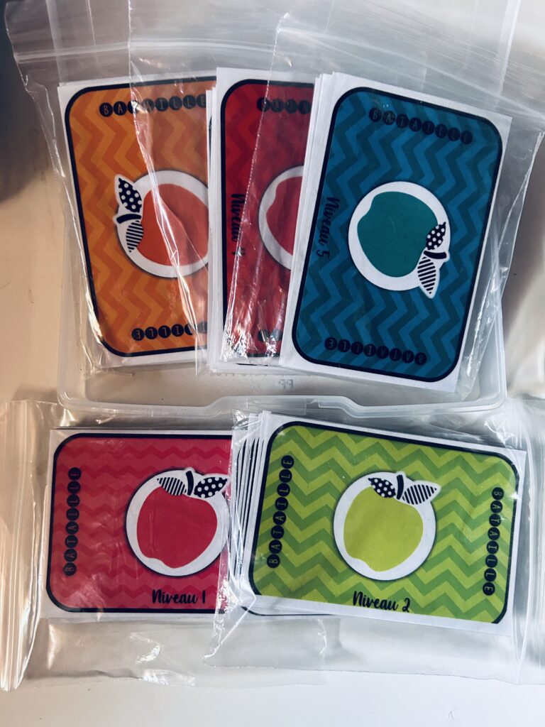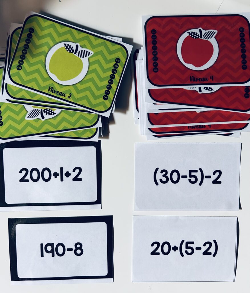 Un jeu de 24 (ou 18) cartes avec des écritures différentes pour les mêmes nombres (ex. : 300, 150 + 150, 3 centaines, etc.).